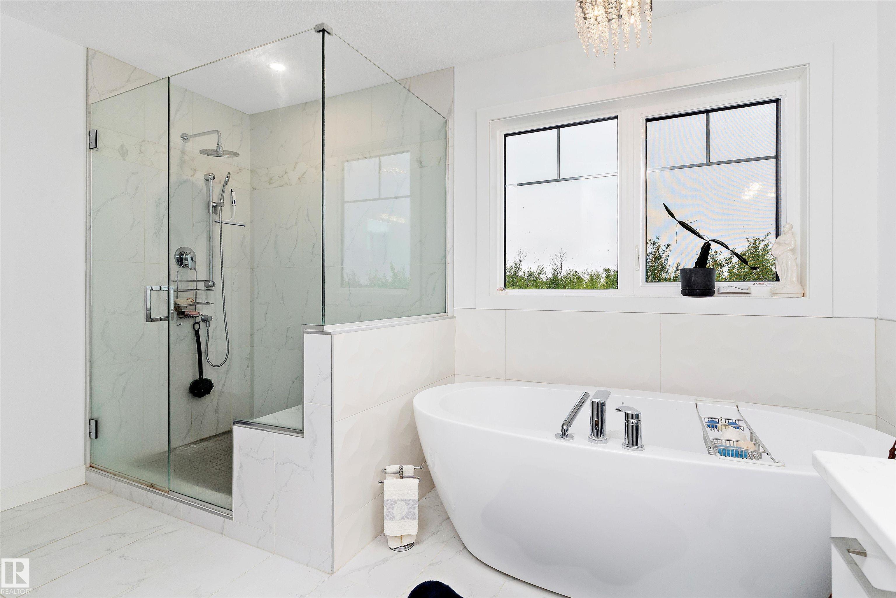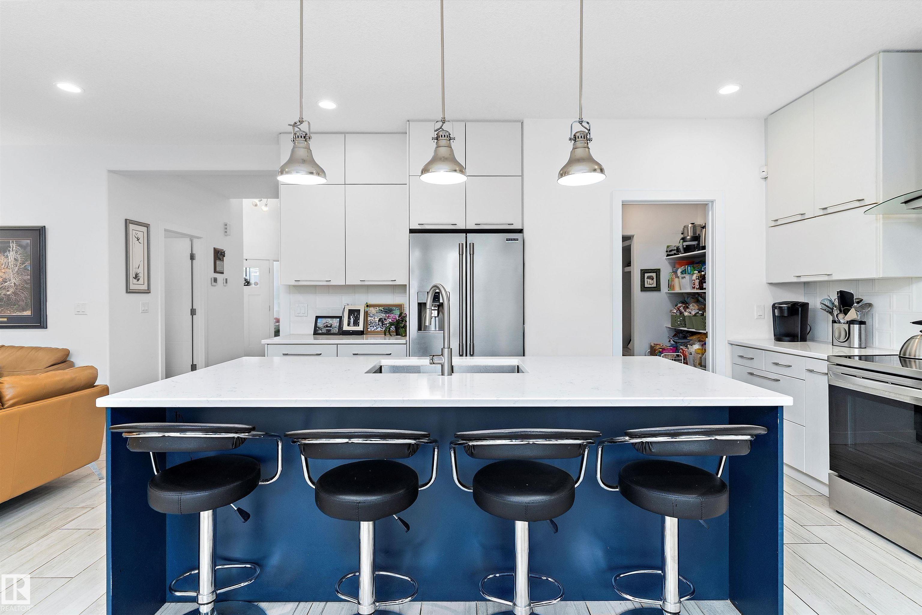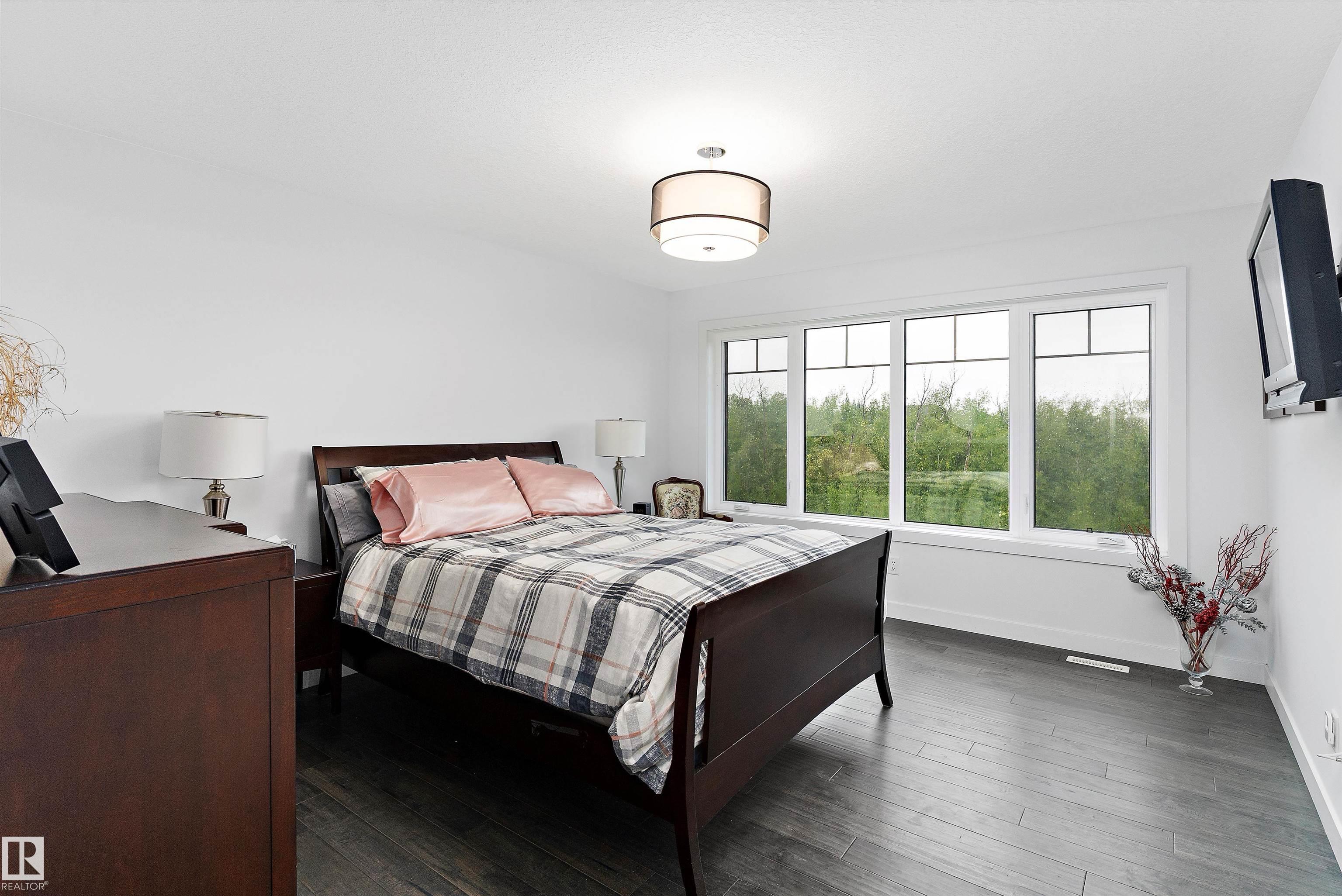 Modern custom-built walkout backing trees & trails! Bright open main floor with tile flooring, linear fireplace & patio doors to a covered, glass-railed deck. Designer kitchen features white cabinetry + navy island, quartz counters, subway backsplash, stainless appliances, and a large island with sink & built-in microwave. Dream laundry room with sink & builtin Cabinetry. The primary retreat offers a spa ensuite with a free-standing tub and oversized glass shower with a rain head. The walkout level extends ...