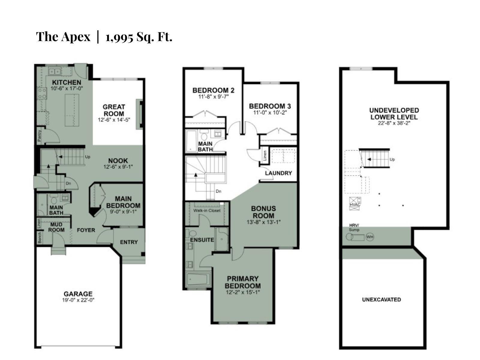 The Apex is a three-bedroom home artfully designed for durability, elegance, and modern family living. It includes a double attached garage with floor drain, 9 ft ceilings on main & basement levels, separate side entrance, and Luxury Vinyl Plank flooring. The foyer leads to a full 3-piece bath with stand-up shower and a bedroom at the back. An open concept nook, great room & kitchen form the heart of the home. The kitchen features quartz countertops, an island with flush eating ledge, built-in microwave, un...